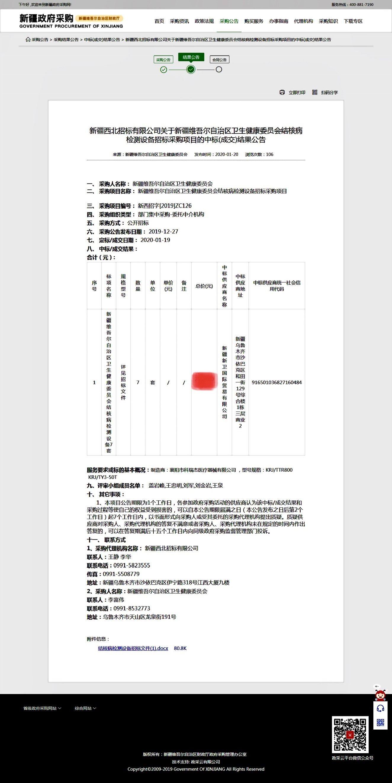 新疆衛生健康委員會(huì )結核病檢測設備采購