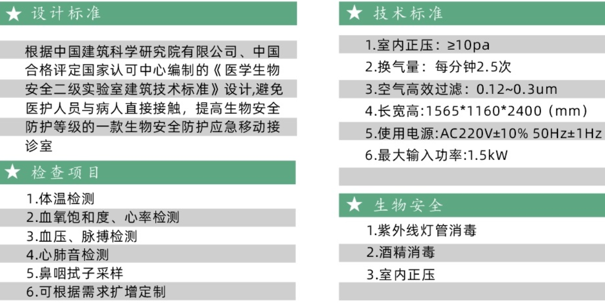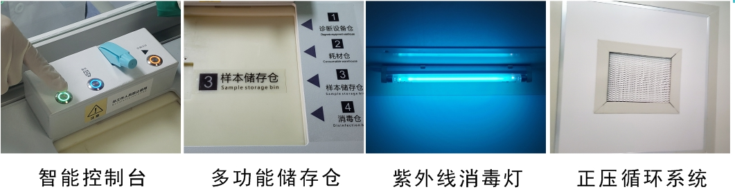 室內正壓并有紫外線(xiàn)消毒、酒精消毒等功能,避免醫護人員與病患直接接觸,提高生物安全等級