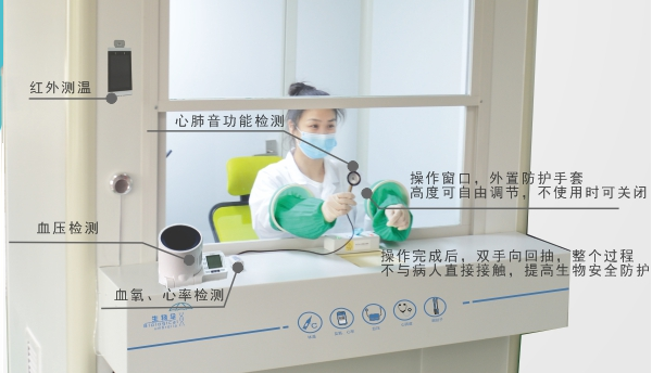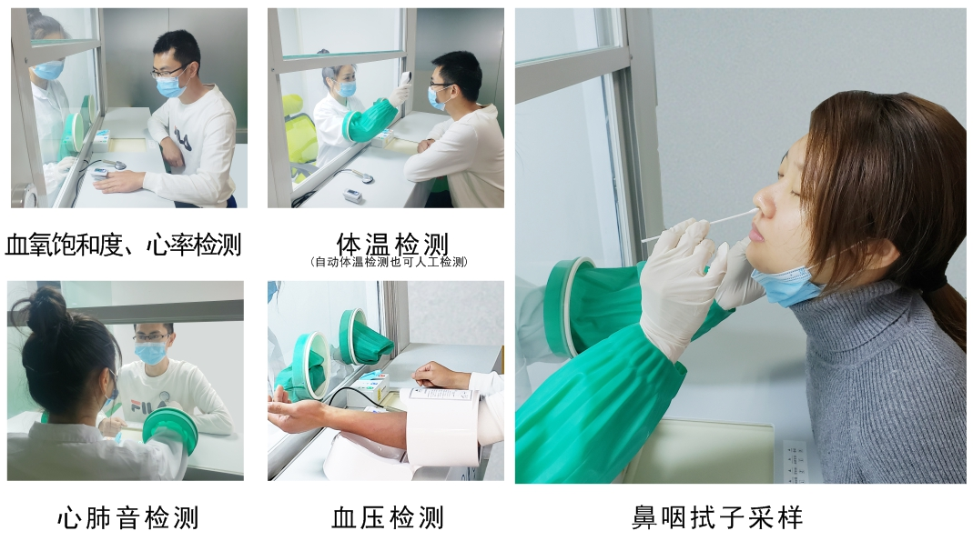 可進(jìn)行無(wú)接觸式鼻咽拭子采集、體溫檢測、心肺音檢查、血氧飽和度、心率檢測、血壓檢測等